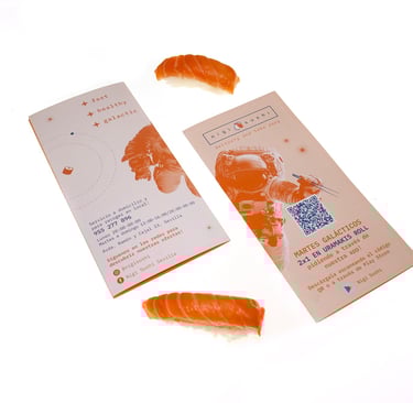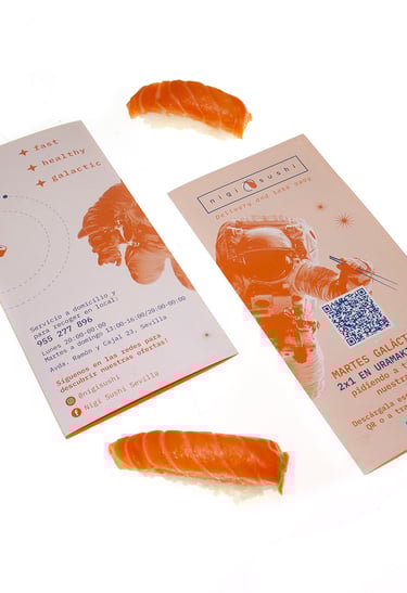 Un restaurante de sushi con un enfoque joven y urbano, pensado espe- cialmente para el público universitario, con servicio takeaway, menús accesibles y alta calidad en sus productos. Se desarrolló el concepto, la identidad, la marca y toda la iconografía en torno a un universo futu- rista, dando forma a una propuesta visual diferenciadora. El proyecto incluyó el diseño de packaging, folletos, carta, rotulación exterior y ves- tuario del equipo, reforzando una experiencia coherente y memorable en todos los puntos de contacto.